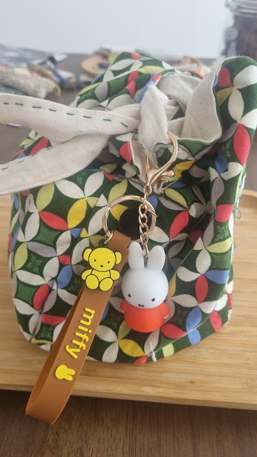 Here is what I did with the green cloth. I actually use it to sew a practise origami bag last year. I love it so much that it has become my carry on bag whenever I'm back in Singapore. Although it looks kinda small, it is super spacious and can carry a lot of things! I even used it to carry my library books sometimes, but only when I am returning, not during borrowing.... hehe. The Miffy charm is from my husband, who got it for me from Korea Airport. He said it was because I kept playing with my friend's daughter's Miffy charm on her bag the whole trip that he decided to get me one. It only cost around 9USD. I didn't know where to put it at first, but then when I saw the green origami bag, I instantly knew they below to each other. It's the color of Miffy!
